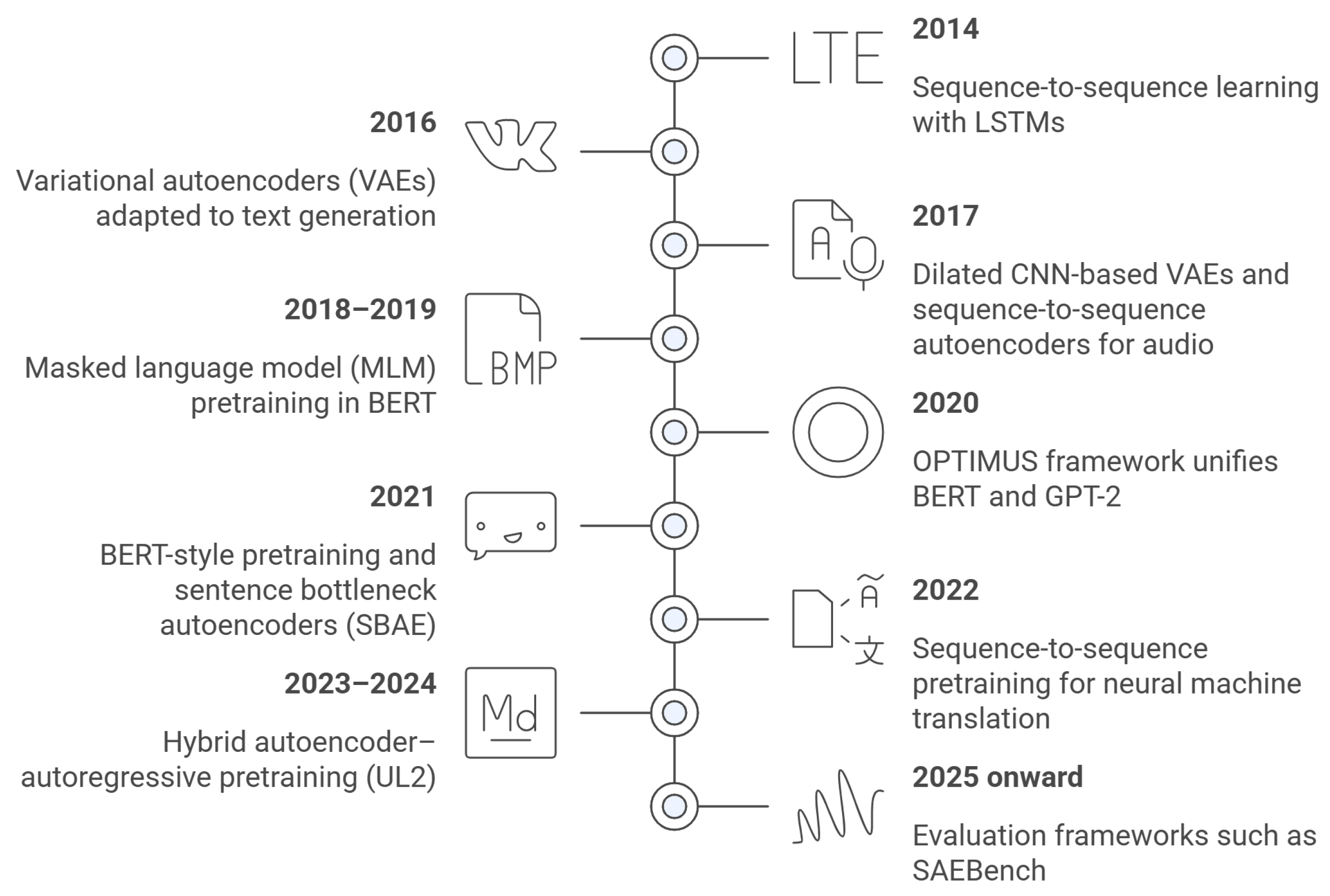 Figure 4 summarizes the evolution of autoencoder-based methods in NLP, from early sequence-to-sequence models with recurrent networks to variational autoencoders for text generation. The introduction of transformer-based masked language modeling marked a shift toward scalable self-supervised pretraining, followed by hybrid encoder–decoder and bottleneck architectures that unify representation learning and generation. More recent work emphasizes hybrid objectives and evaluation frameworks, reflecting a maturation of autoencoder-style learning in modern NLP.