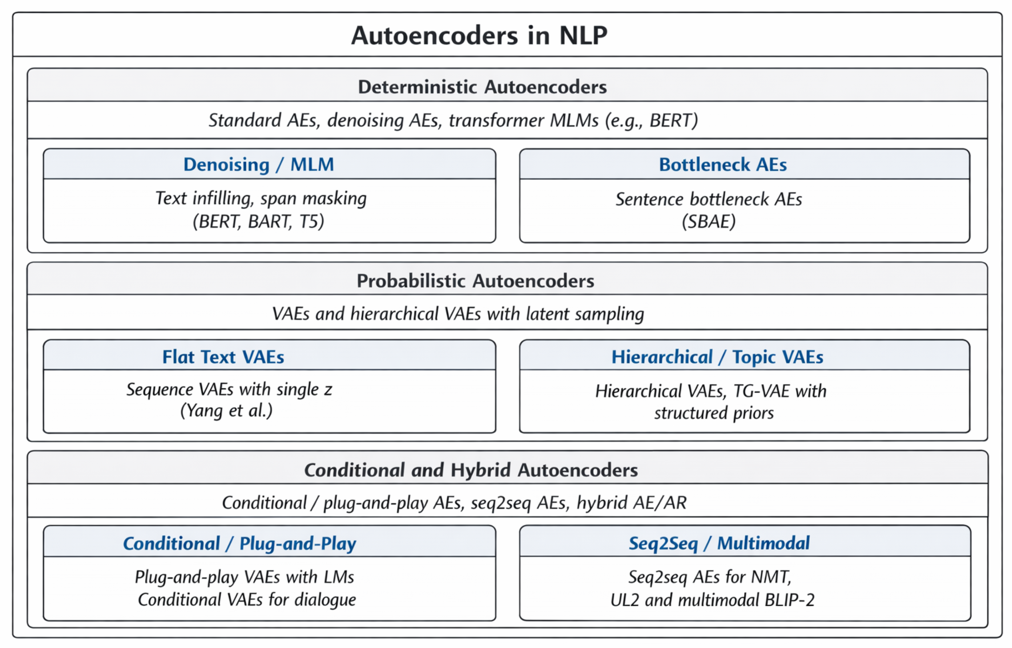 Autoencoder-based models in NLP can be broadly categorized according to their latent structure, conditioning mechanisms, and reconstruction objectives. In this survey, we adopt the following taxonomy: