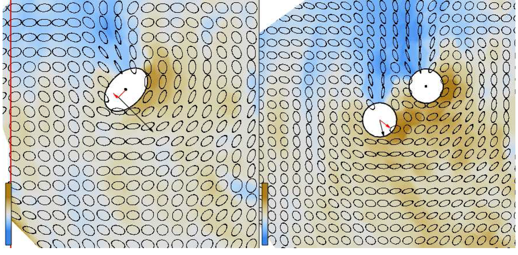 Figure 6). The falling-discs simulates two discs falling through a monodisperse (bubbles having equal volume) foam under gravity. It contains 330 time steps and simulates 2200 bubbles. The two discs are initially side-by-side and in close proximity. As they fall, they interact with the foam and each other by rotating towards a stable orientation in which the line that connects their centres is parallel to gravity. The falling-ellipse simulates an ellipse falling through a monodisperse foam under gravity. This dataset contains 540 time steps and simulates 600 bubbles. The major axis of the ellipse is initially horizontal. As the ellipse falls, it rotates toward a stable orientation in which its major axis is parallel to gravity. The constriction dataset contains two simulations, one with a square-constriction and one with a rounded-constriction (