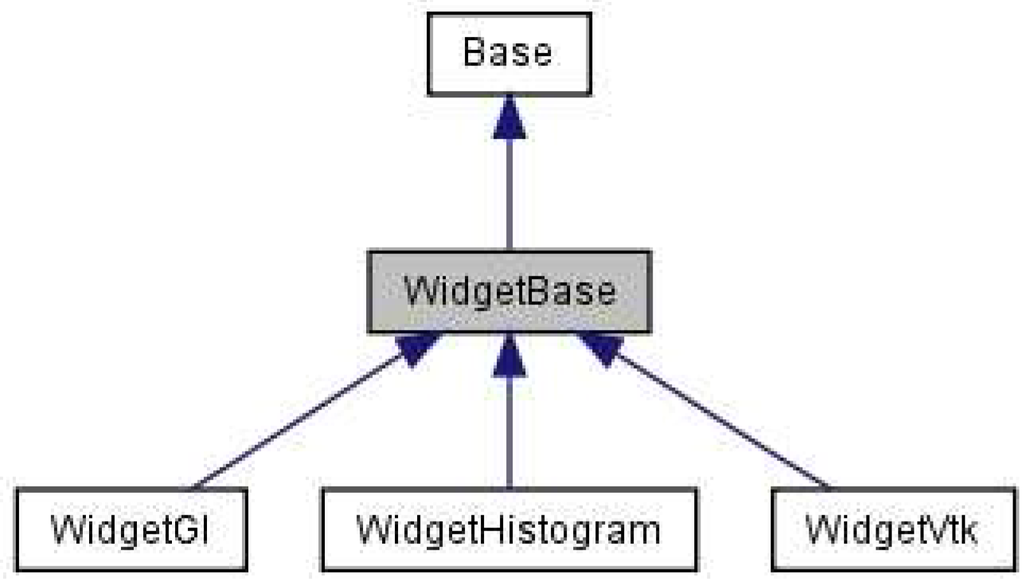 WidgetBase inheritance graph. This class provides functionality common to all views. It inherits from Base, which stores the simulation data and program status. WidgetGl displays views rendered with OpenGl. WidgetVtk displays views rendered with VTK, and WidgetHistogram displays histograms.