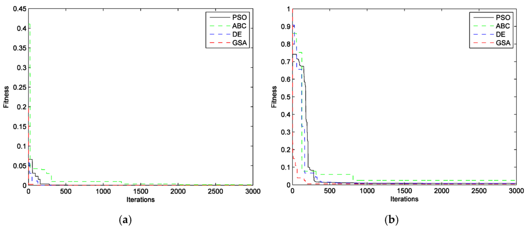 Since the convergence rate of evolutionary algorithms is an important characteristic to assess their performance for solving the optimization problems, the convergence of all algorithms facing functions and is compared in Figure 3a,b. The remarkable convergence rate of the proposed algorithm can be observed in both figures. According to these figures, it tends to find the global optimum faster than other algorithms.