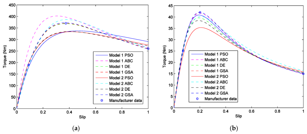 Curve slip vs. torque via PSO, ABC, DE, and GSA considering Model 1 (), Model 2 (), (a) Motor 1, and (b) Motor 2.