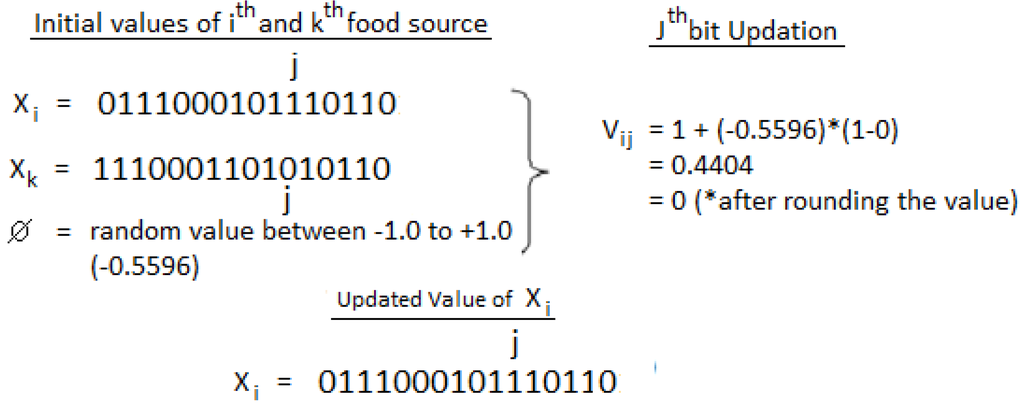 As an example, suppose 0111000101110110 is a population member (size 16 bit), representing (the i-th member of the population set) and updating through population member 1110001101010110 representing (the k-th member of the population set). The randomly-selected position updating is 11th, which represents the j-th value in the above equation. Ø is the random value between −1.0 and +1.0 and taken as 0.5596 for this particular example. Figure 2 shows the position updating as follows.