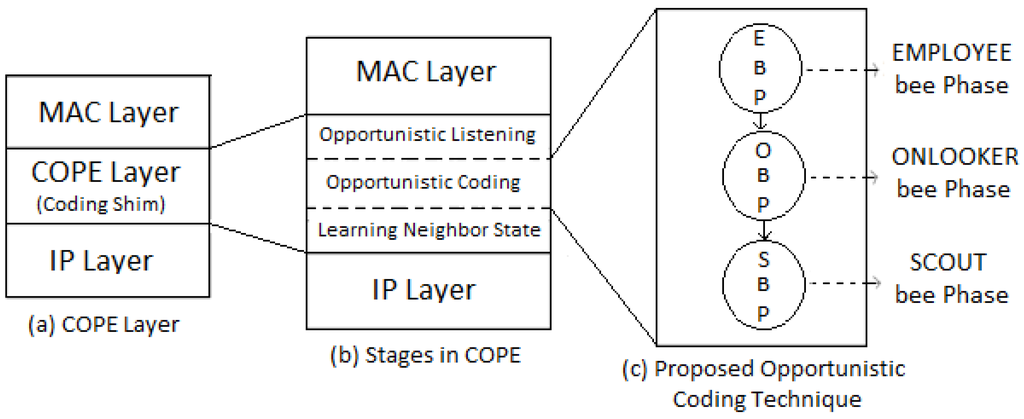 Employee and onlooker bees are responsible for the updating process to approach the global solution of the problem. Exploration of the new food source is carried out by scout bees. The computation of the nectar amount corresponds to the quality of the solution for a particular problem. A similar technique is proposed in the next section to find a better encoding solution of the buffered native packet at intermediate nodes. A conceptual paper on the artificial bee colony-based COPE framework is presented in []. The author mentioned that the theoretical concept of the nature-inspired optimization technique in existing probabilistic COPE may enhance the network throughput and efficiency. COPE inserts a coding shim layer between IP and MAC, as shown in Figure 3, Stage (a). To improve network throughput, COPE distributes the work in three stages, as shown in Figure 3, Stage (b). In the proposed work, the intelligent approach is incorporated for better packet combination in opportunistic coding, as shown in Figure 3, Stage (c).