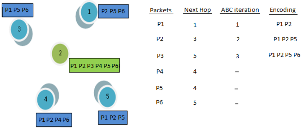 The initial population is randomly generated by scout bees based on the packets at the node’s output queue. In the proposed implementation, the initial partially-encoded packet size varies from 2–11, i.e., the encoded packet contains 2–11 native packets (uncoded packets). The range may vary depending on the processing and memory capacity. Based on the initial encoded packets, all three phases of the algorithm have repeatedly found the best possible final encoded packet of maximum objective value. The objective function is the number of neighboring nodes able to decode the current encoded packet correctly. We have chosen a large number of iterations (n = 1000) for better packet combination. The existing COPE is probabilistic in nature, whereas our proposed one would give a better combination after a certain number of iterations. Our proposed algorithm accuracy depends on the number of iterations specified by the algorithm; the proposed algorithm performance will be evaluated by varying the number of iterations in the given algorithm. The proposed algorithm’s practical implementation depends on the availability of existing physical resources.