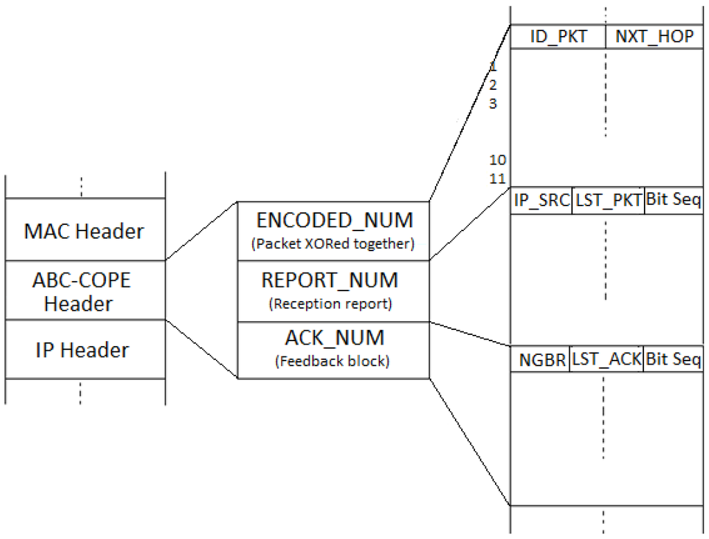 Similar to the COPE protocol, the ABC-COPE header is attached along with the MAC and IP header.