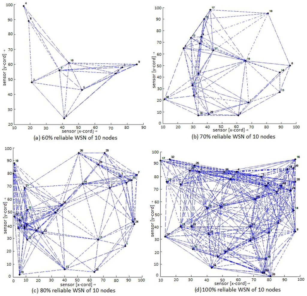This section shows the results and comparison of our nature-inspired encoding algorithm with COPE Framework. The implementation is done in MATLAB R2008a Version 7.6.0.324. The proposed algorithm was executed on a WSN of Nodes 10–40. Nodes are randomly distributed over an area of 100 × 100 unit. In the result, the coding gains of COPE and ABC-COPE are evaluated for medium delivering probabilities of 100%, 80%, 70% and 60%. The delivering probability represents the information about storing packets at the neighboring node’s buffer, i.e., successful delivery of reception reports. The proposed algorithm is a heuristic iterative approach, whereas COPE is probabilistic. This paper shows the above differences with respect to the network coding gain. Some examples (Figure 6) of randomly-distributed WSNs are shown below. The dots represent the sensor nodes, and dashed lines shows wireless communication links among the sensors. The following WSN shows the number of nodes varying with the reliability factor. The reliability factor is increasing 60%, 70%, 80% and 100%. The number of nodes in the network is varying from 10–40 nodes.