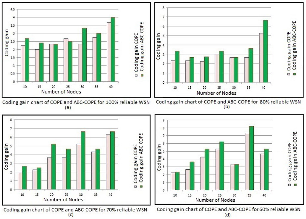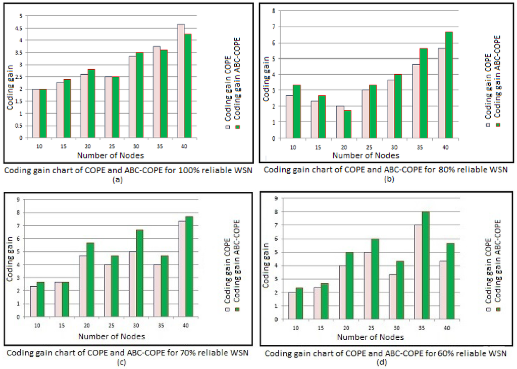 Coding gain comparisons are given below. In the bar chart, X-axis values represent the number of nodes in the sensor network, and Y-axis values represent a coding gain. It is clearly seen that the coding gain improvement is good for 80%, 70% and 60% reliable networks, whereas for a 100% reliable network, it is as good as COPE. In real life, most of the wireless networks are less error prone due to limited resources. Therefore, the proposed mathematical model concludes that ABC-COPE could give better network coding gain in error prone WSNs with limited resources.