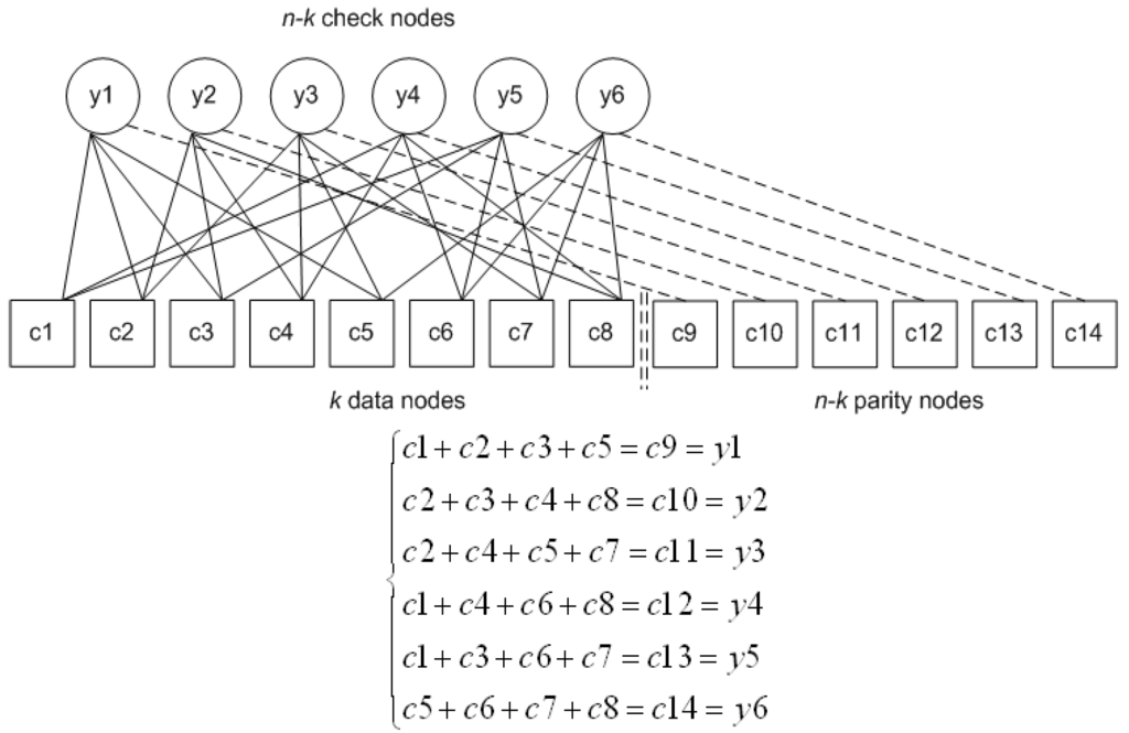 Section 2 analyzed LDPC and its cousin channel code LDGM in terms of matrix operations. Instead advantage can be taken of the sparseness of the matrices to reduce the computational complexity. This is achievable by exploiting an alternative representation of the codes in a Tanner graph, a type of bi-partite graph. The same representation is the basis of the iterative belief propagation decoding algorithm mentioned in Section 1. A Tanner graph connects code nodes, , and check nodes, . The code nodes comprise the information data together with the parity or redundant data. The check nodes describe how the input data are XORed together but they are not output as part of the coded data stream. Figure 1 shows an example of a bi-partite Tanner graph by way of explanation. Lines connecting the information data code nodes to the check nodes indicate how the data are XORed together. (Notice that XORing corresponds to modulo 2 addition.) The summation forms the output to the  parity code nodes. Reiterating, in an LDGM code (unlike some other codes), the parity code nodes are each derived from just one check node. The Tanner graph only indicates how the data symbols are combined. For example, if each symbol is a fixed-size data block it is the data blocks that are bitwise XORed together according to the pattern given in Figure 1 and, in general, with whatever pattern is indicated by matrix H (as matrix H is used as a generator matrix in LDGM). It should also be remarked that for LDGM codes if random generation of the “1s” in H, subject to the constraint of (7) results in a cycle of four, this cycle is removed by rearranging the matrix. Cycles of four occur when two data nodes are connected to the same two check nodes in the Tanner graph representation. The reason for this rearrangement is that cycles of four are known to result in weaker decoding performance.