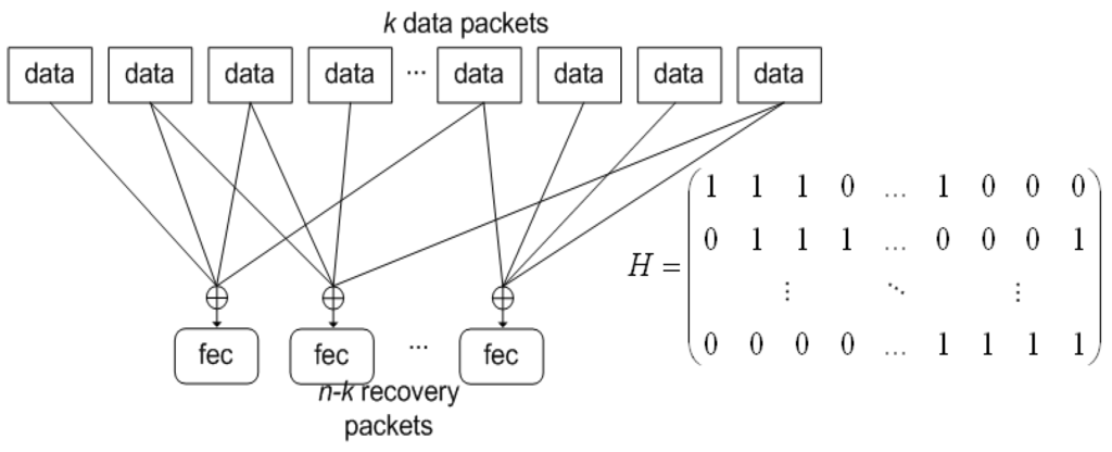 Thus, in LDGM codes, a recovery packet is generated for each row of H, as the result of applying bitwise XOR operations to the data packets corresponding to the entries equal to “1” in H, as described by Figure 1. The process to do this at the data-packet level is shown in Figure 2. Equally, each row of H indicates which data packets are combined to form a FEC packet. Each row provides recovery for just one packet. Thus, if any one packet indicated by the presence of a “1” in the row is lost it can be recovered by bitwise XORing with the remaining packets together with the corresponding FEC packet. If more than one packet in a row is lost in an error burst then it is no longer possible to recover a packet using that row alone. This property can also be deduced from the equations in Figure 1. However, if more than one packet in a row has been lost it is possible to replace one or more of those packets by first using the recovery properties of other rows. Nevertheless, the recovery becomes problematic if error bursts occur, because then more rows face the loss of more than one packet. The longer the error burst the more likely that a number of rows within sparse H could be affected. This issue is returned to in Section 3.2.