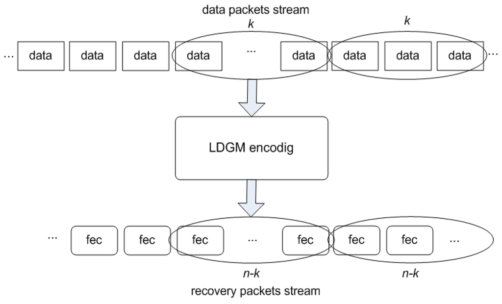 To take advantage of the possibility of allowing the information data to by-pass decoding if no errors are detected, the information and parity data can be separated into two streams. The three main steps of the protection scheme are illustrated in Figure 3: (i) division of data into blocks of low k, (ii) encoding of each block of k information data packets, and (iii) the outcome of the coding for each block of k data packets then forms a set of  packets.
