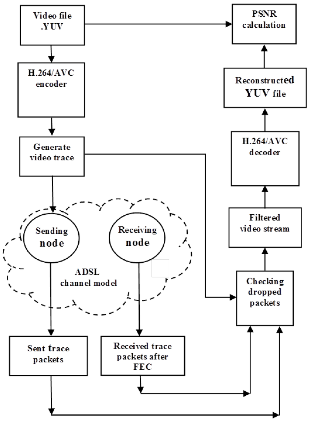 To provide a realistic evaluation of video distortion, tests used the reference video sequence Football, with plenty of motion activity, which increases the temporal compression coding dependencies. In order to judge the video distortion, a video trace was fed into a numerical simulator (refer to Figure 4) where ADSL packetization took place. After numerical simulation, data from the ADSL packets judged lost were removed from the compressed video bitstream, prior to passing through the H.264/Advanced Video Coding (AVC) [] decoder. The resulting bitstreams (before and after LDGM repair) were compared to the YUV video input to determine the Peak Signal-to-Noise Ratio (PSNR).