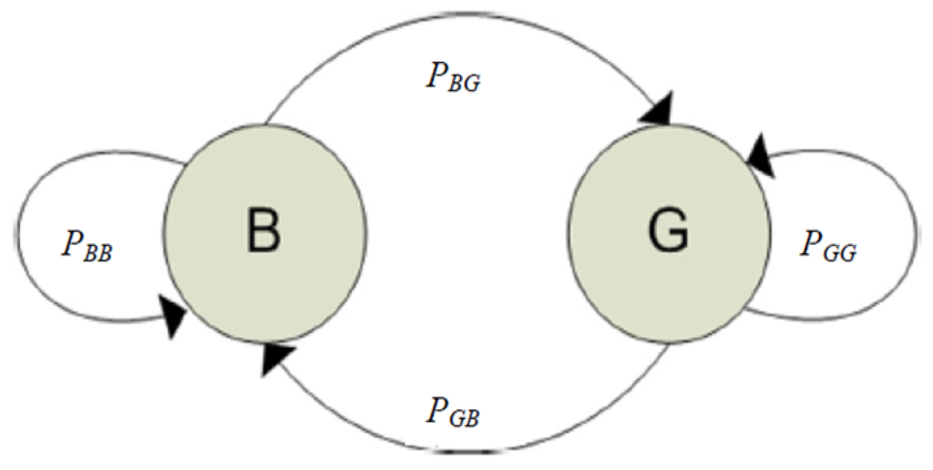 To model adverse channel conditions across a wireless link, “bursty” errors (time correlated errors) were modeled by a Gilbert-Elliott two-state hidden Markov model [], as illustrated in Figure 5. This channel model was introduced into the ns-2 simulator. The Gilbert-Elliott channel model itself forms a two-state Markov chain. It is based on good and bad states, the probabilities of these states, and the probabilities of the transition states between them. In the bad state, B, losses happen with higher probability, whereas in the good state, G, losses happen with lower probability.
