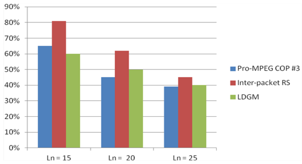 From Figure 6, it is apparent that inter-packet RS [] has the highest error-recovery property, which will also be higher than the standard intra-packet method. However, the industry standard Pro-MPEG COP #3 deteriorates sharply in its error recovery capability when the burst length increases. At packet burst lengths of 20 and 25 packets, LDGM provides better error recovery properties than Pro-MPEG COP #3. Moreover, the Pro-MPEG COP #3 latency budget is much longer in duration of time than LDGM because all packets in Pro-MPEG COP #3’s interleaving matrix must first be assembled at the encoder (and likewise arrive at the decoder). Similarly, for RS coding there is a latency budget of k packets at the encoder for the intra-packet version and k.m for the evaluated inter-packet version. Moreover, as previously mentioned, when using LDGM, decoding can begin at an early stage when applying the belief-propagation algorithm. The computational complexity of the RS algorithm, according to Section 2, is much higher than that of LDGM.