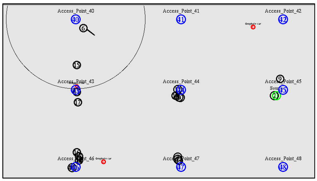 The self-driving communication simulation is carried out using ns-2 and employs four abnormal vehicles: two rushing attacks and two grey hole attacks on the system. Figure 3 shows the system simulation designed in ns-2.