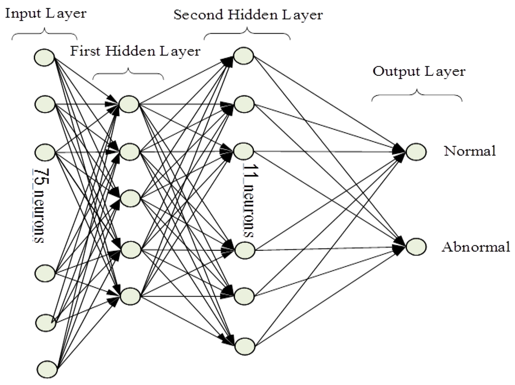 The FFNN includes one or more hidden layer, the input layer and the output layer. The input layer is made up of 75 neurons, which equals the number of fuzzified features obtained from the trace file after using a fuzzy set. We utilise two hidden layers to raise the accuracy of detection of the system and to reduce the amount of false alarms. There are five neurons in the first hidden layer while the second hidden layer contains 11 neurons. There are two neurons (normal and abnormal) in the output layer. In order to determine the optimal FFNN configuration in terms of hidden neurons and layers, we made use of the trial and error method in order to configure and choose the best ratio of training based on the situation selected that have been created in the proposed system. The parameters in the initial stages have a vital role to play in the performance of the FFNN, which has a direct effect on the performance of detection. We show in Figure 4 below the optimal structure of the FFNN that was thus determined.