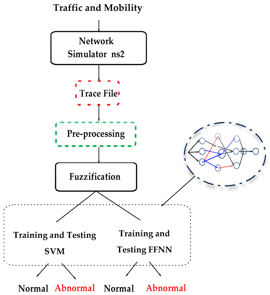 In this section, we detail an intelligent IDS that utilises SVM and FFNN to identify the vehicles performing rushing attacks and grey hole attack in VANETs. Our proposed IDS makes use of a data set of 30,000 records to define the normal and malicious behaviours in VANETs. The data set, obtained from the trace file, was split into three subsets: (1) the validation set; (2) the test set; and (3) the training set. This is in order to manage a common problem with neural networks Artificial Neural Network (ANN), i.e., the over-fitting of training data.