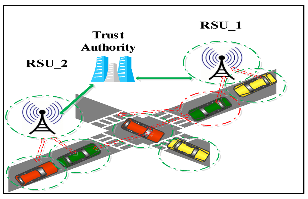 Vehicular ad hoc networks (VANETs) play a vital role in the growth and the use of self-driving and semi self-driving vehicles [1]. Internal and external communication systems are considered important components in autonomous and semi-autonomous cars. VANETs represent the communication between vehicles (V2R) and their Road Side Units (RSUs) or intra vehicular communication (V2V) in radio coverage areas, as shown in Figure 1.
