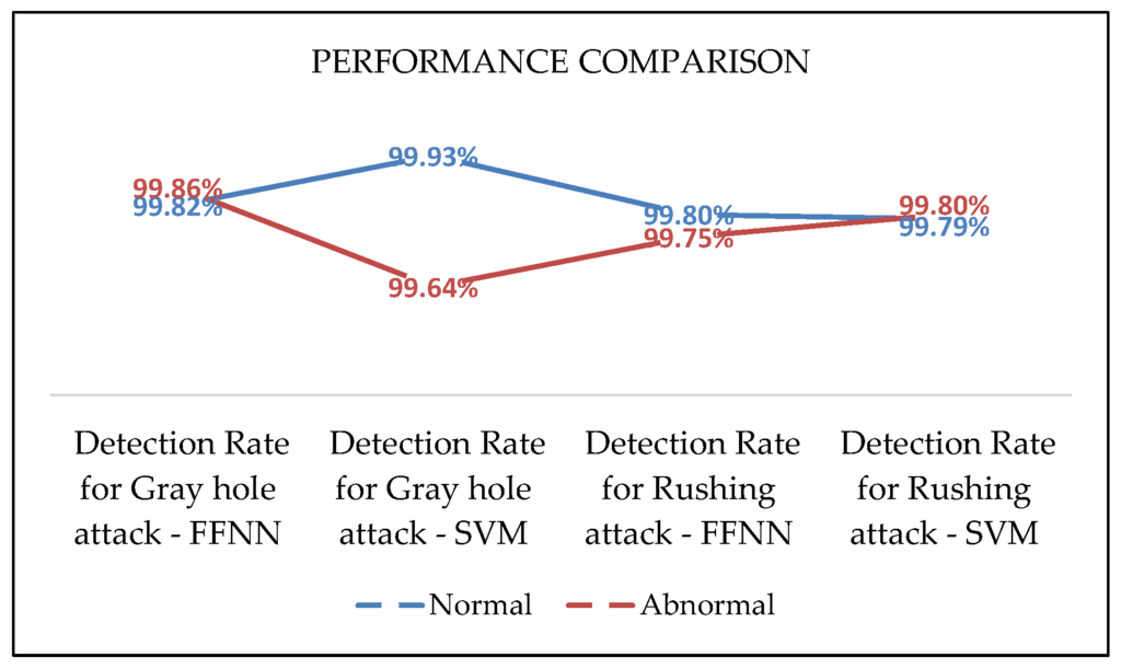 The core objective of this research was to create an IDS that provides a secure environment for self-driving and semi self-driving vehicles. We implemented the methodology of this IDS in eight phases, which lead to generating the mobility and traffic model, the trace file, the ns-2, fuzzification, data collection and pre-processing, training and testing for the SVM, and training and testing for the FFNN, and compared the results we generated from the two types of IDS. In Figure 7, two IDS are compared; we found that the IDS based on the FFNN was more effective and efficient in determining abnormal vehicles with a smaller false negative alarm rate than the IDS using SVM; however, we can observe that SVM performance is much higher that of the FFNN. SVM is faster than FFNN because the SVM automatically computes the number of hidden layers in an optimised way [46]. Figure 7 also shows the difference in the performance of FFNN and SVM. The IDS system based on SVM had an error rate of 0.19%. However, in this particular system, there was fluctuation of alarm rates between 99.92% and 99.70% with high rate and efficient accuracy. Alternatively, the average false negative rate of alarm recorded was low, around 0.20%, which is a good indicator of the performance of the results.
