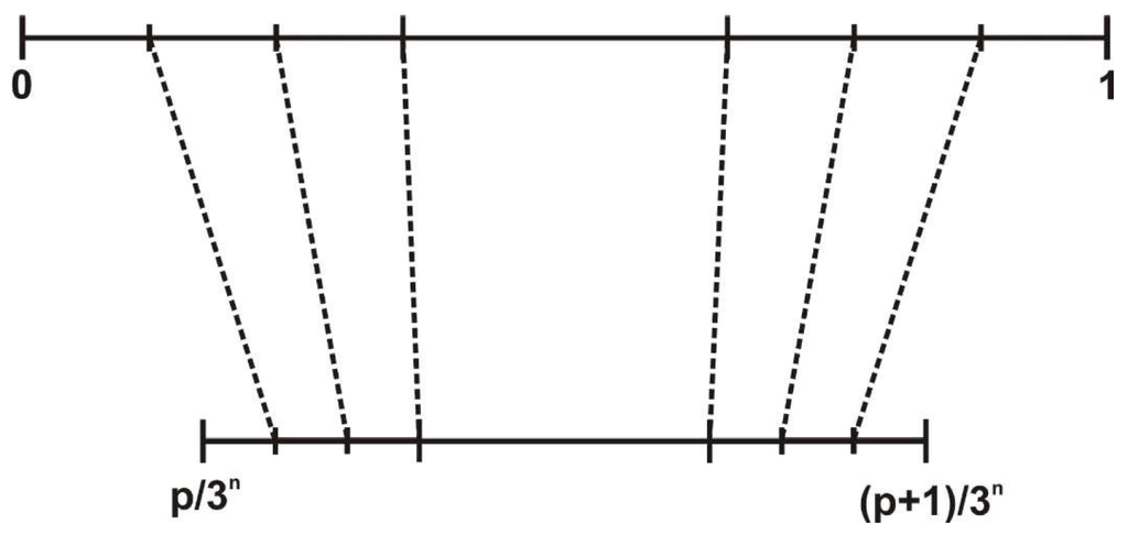 is a self-similar set. Any closed interval that remained after we had eliminated the open intervals, after an infinite number of steps of the construction procedure, has a structure that is equivalent to . Indeed, considering the one-to-one application of with one of its subsets, which is Cantor’s set built on the initiator with p conveniently chosen, we can easily find their equivalence (Figure 4).