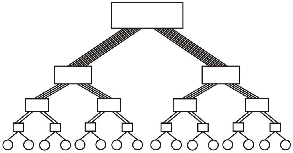 Similarly to a full and complete binary tree, the composing process can continue indefinitely. Every subtree is a fat tree. This gives to the fat tree a self-similar characteristic (Figure 6).