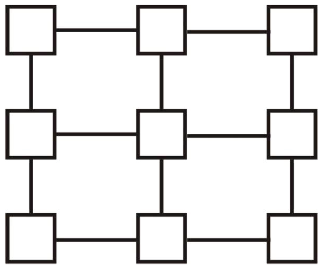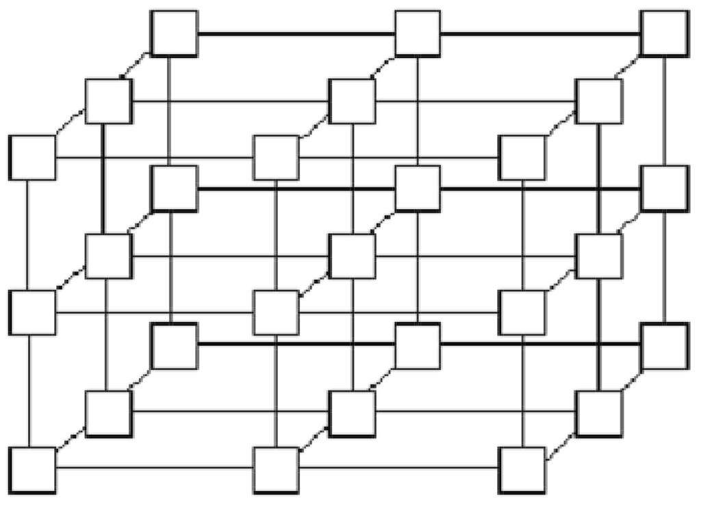 It is easy to observe that if we consider a piece of the k-dimensional array, defined by subsets of indices for each j-dimension, , the corresponding structure is also a mesh (Figure 7 and Figure 8). In such a piece, vertex is adjacent to vertex , where . Vertex is adjacent to vertex , where .