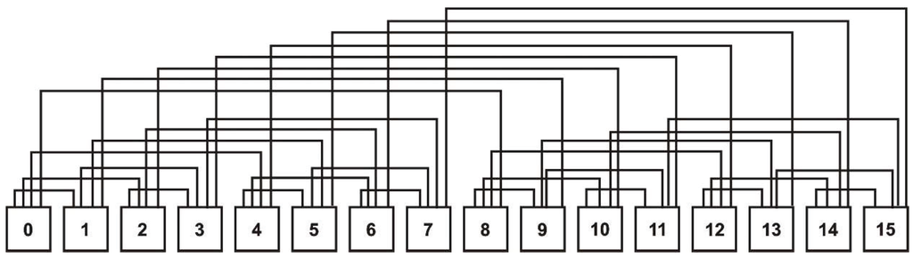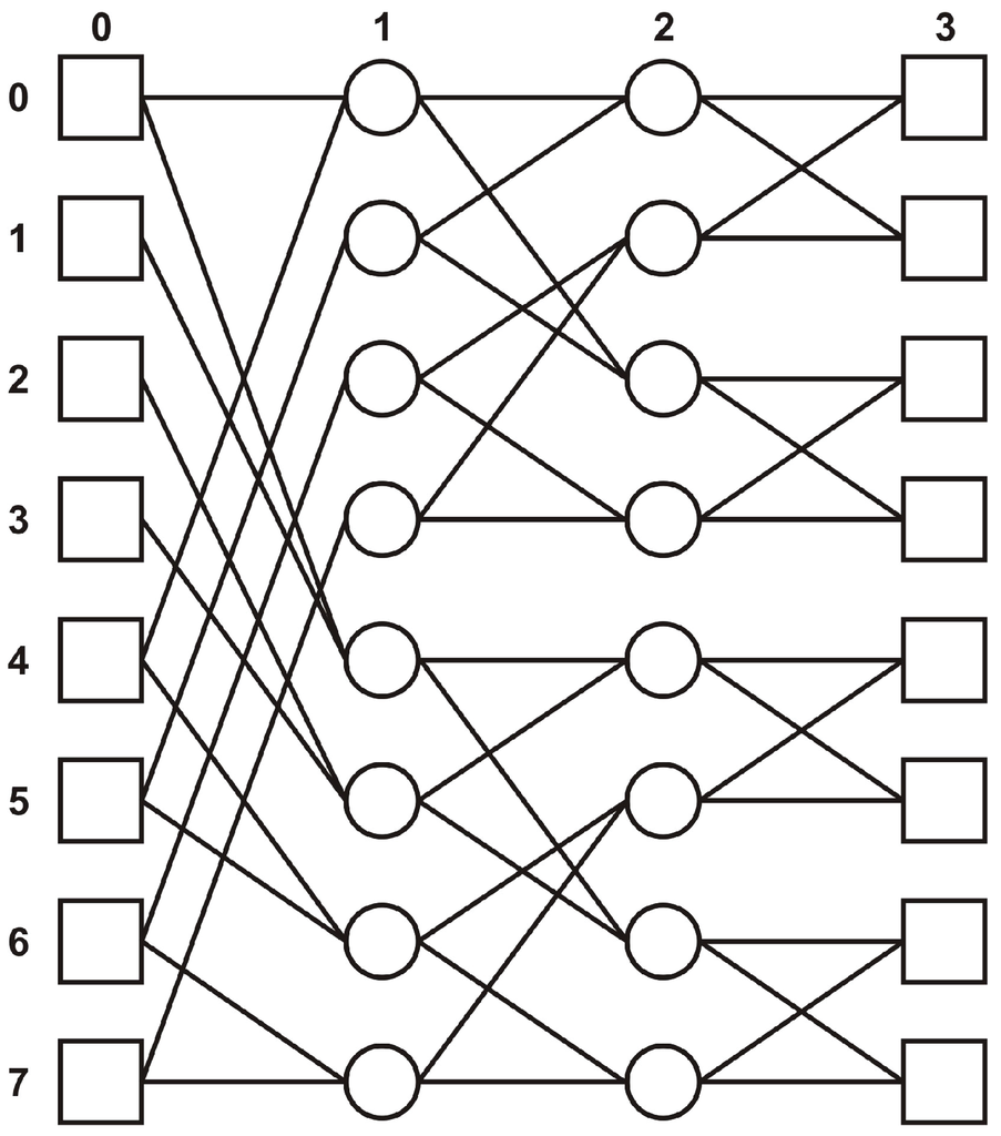 Banyan is also a communication topology where the set of vertices, V, is organized analogously to butterfly as a two-dimensional array of size , where , via an indexation function . We denote by the vertex given by . The vertex , located on the column j, is connected to the column with the vertices and , where ⊕ means addition modulo .