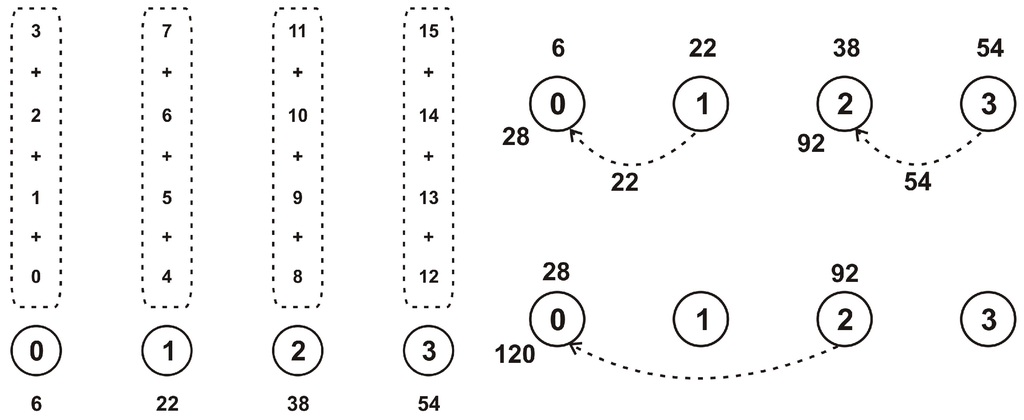 | Algorithm 2 Summing integers on a hypercube with vertices (q dimensions, ): pseudocode for the processing unit located at vertex i. |