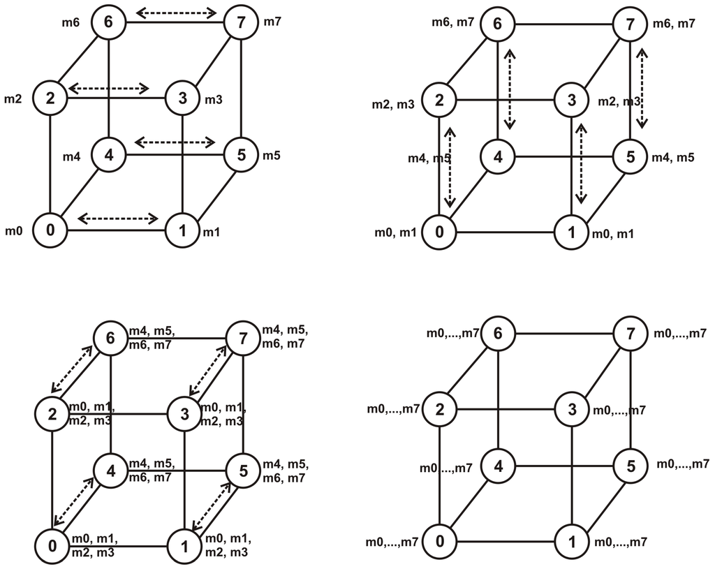 Example of all-to-all communication on a three-dimensional hypercube.