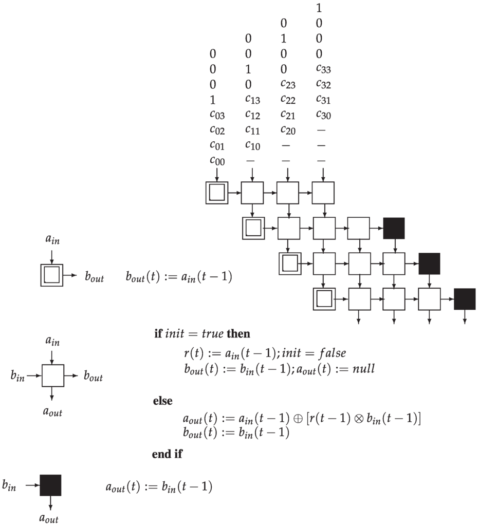There are multiple systolic approaches of the algebraic problem of paths. Noteworthy is the implementation of Kleen’s algorithm on a connected-mesh network given by Y. Robert and D. Trystram [15]. See Figure 17.