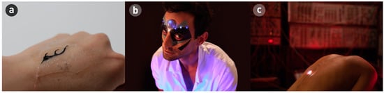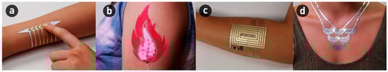 - Lo, J.; Lee, D.J.L.; Wong, N.; Bui, D.; Paulos, E. Skintillates. In Proceedings of the 2016 ACM Conference on Designing Interactive Systems, DIS ’16, Brisbane, Australia, 4–8 June 2016; ACM Press: New York, NY, USA, 2016; pp. 853–864. [Google Scholar]