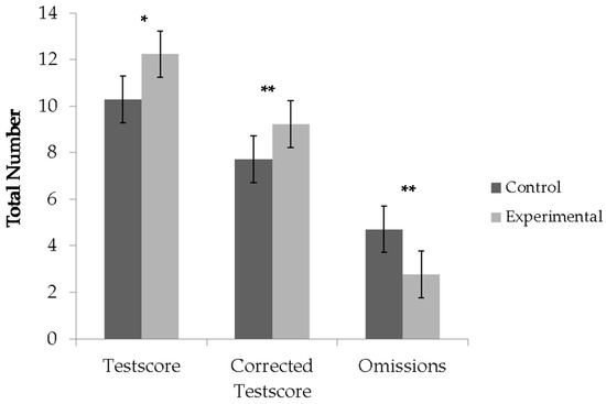Figure 2. Mean differences between the control and experimental group. The bars represent the standard error. * p < 0.01, ** p < 0.005.