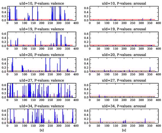 P-values for the null hypothesis testing showing the effect of the positive reinforcement for five test participants, separately for valence (left) and arousal (right). The horizontal red line marks the significance level , with p-values below the line indicating significant effect.