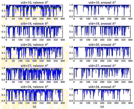 Table 1 shows the average values of s for the test participants—these values are part of the explained variance for the learner’s affective state during the tutoring session. The average s vary across test participants from to for valence and to for arousal, for all time intervals. If we average only over the time intervals when the positive reinforcement is active, the average value of s varies across the participants from to for valence and to for arousal.