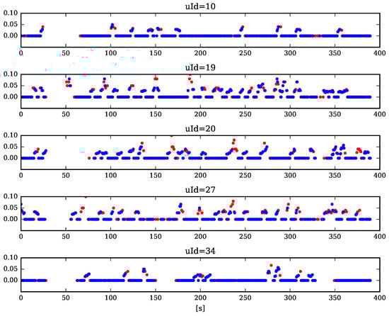 Additional insight is given by the analysis of the learners’ error rates throughout the test segment, presented in Figure 7. Again, these results represent the underlying design of the machine emotion model, which only rewards learner’s performance. As shown in Figure 7, the average number of errors (through time) is higher for the intervals with no reinforcement (defined by the neutral emoticon (red dot)), compared to the instances when reinforcement is active (positive emoticon (blue dot)). However, note that the occasional short time intervals of good performance are also represented by the neutral emoticon (red dot), due to the delay in the positive reinforcement (see Section 3.3.1). Missing values are due to the self-report (at 30 s) or the default interruption in the tutoring session (see Section 4), or when the typing was paused by the learner.