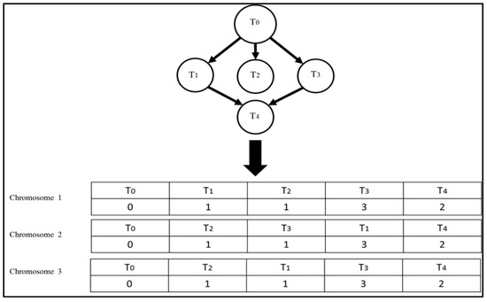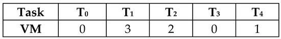 In the genetic algorithm, a schedule (solution) is represented by a chromosome. For a task scheduling problem, a chromosome can be viewed as a two dimensional array of length N, where N is the number of tasks. The first row of a chromosome is an ordered list of tasks (from left to right) and the second row represents the corresponding virtual machine number on which a task is assigned for execution, as shown in Figure 2. The latest start time, completion time, and earliest start time for each task in the schedule can be calculated using Equations (1), (3), and (4), respectively.