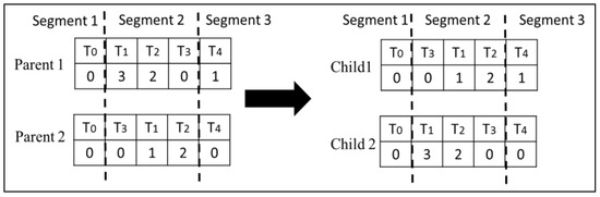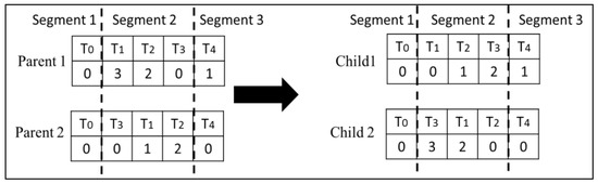 Type 1 Crossover: This crossover operator swaps corresponding randomly selected segments of two chromosomes. This ensures that the topological order in both children is preserved. Figure 4 illustrates how this crossover is performed on the second segment of the chromosomes.