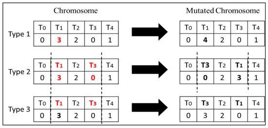 The mutation operator randomly selects a gene in a chromosome and changes it with a given probability. We propose three different types of mutations as explained below: