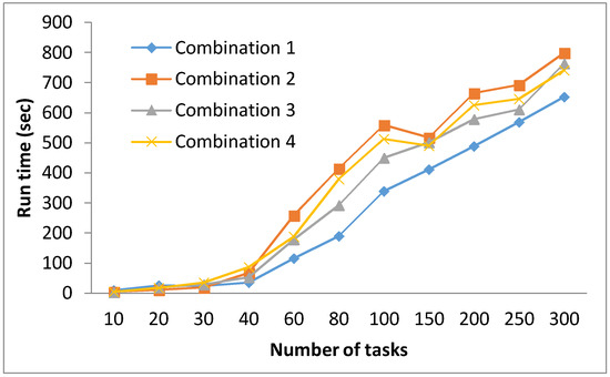 Table 4 provides the results for the four combinations for each test case. It is observed from these tables that for the majority of test cases, Combination 4 produced the best results. More specifically, Combination 4 generated the minimum cost for 20, 30, 80, 100, and 200 tasks. Combination 2 produced the best results for four test cases, which were 60, 150, 250, and 300. The other two combinations produced the best results for only one test case each, making them the worst performers. Therefore, based on the results, it can be fairly claimed that Combination 4 was much better than combinations 1 and 2, while showing relatively better performance than Combination 3 as far as the quality of results is concerned.