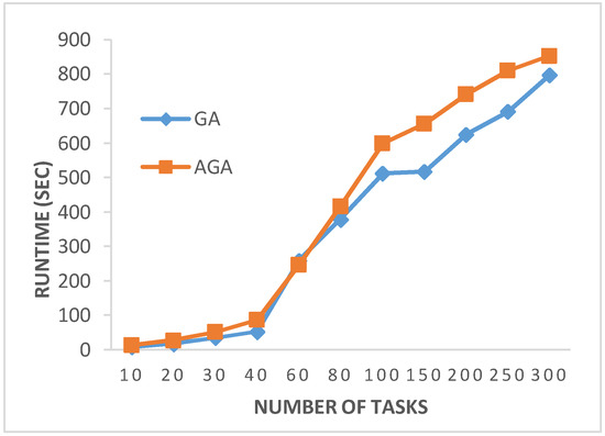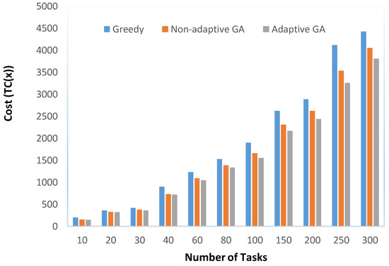 Table 6 provides the cost obtained by each algorithm. For GA and AGA, the average cost (averaged over 30 runs) is reported. The results indicate that the greedy algorithm produced solutions of inferior quality as compared to GA and AGA, as expected. With respect to the mutual comparison of GA and AGA, the results indicate that AGA outperformed GA in all test cases. These observations are elaborated through Figure 8 which clearly indicates that AGA produced solutions with the lowest cost for all the test cases. Table 7 reflects the percentage improvement achieved by AGA with respect to the other three algorithms. The results indicate that the improvements achieved by an AGA with respect to the greedy algorithm were significantly high, in the range of 12% to over 35%. As far as a GA and AGA are concerned, the percentage improvements by an AGA were in the range of over 1.79% to 8.43%. These improvements were subjected to statistical testing. The results of this statistical testing indicated that a huge majority of improvements achieved by an AGA were statistically significant. Two exceptions were test cases with 20 and 40 tasks where the improvements were not statistically significant.