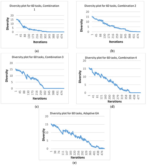 Another measure used to assess the effectiveness of the approach used in AGA was population diversity. Diversity is a measure used to calculate the average distance of each chromosome from the mean value. Diversity is calculated in every iteration during the execution of the algorithm [44]. The effect of the four different GA combinations as well as that of AGA on the population diversity was investigated. The purpose was to observe whether AGA was capable of reducing the possibility of premature convergence and preventing the algorithm from getting stuck in local minima. As an example, Figure 10 shows the diversity plots for one typical run for the four GA combinations as well as adaptive GA, while using the DAG of 60 tasks, and while running each algorithm for 500 iterations. The figure indicates that an AGA maintained sufficient diversity until the end of execution, while a GA with four combinations was unable to maintain diversity for longer durations. More specifically, for combinations 1 and 3, the diversity almost became zero before 330 iterations. Combinations 2 and 4 were better than the other two combinations in the sense that the diversity was maintained until around 400 iterations. However, for an AGA, the population had non-zero diversity even at the end of execution as is evident from Figure 10e. Therefore, it can be confidently claimed that an AGA was better than the other four combinations in terms of maintaining population diversity and consequently giving solutions of better quality.