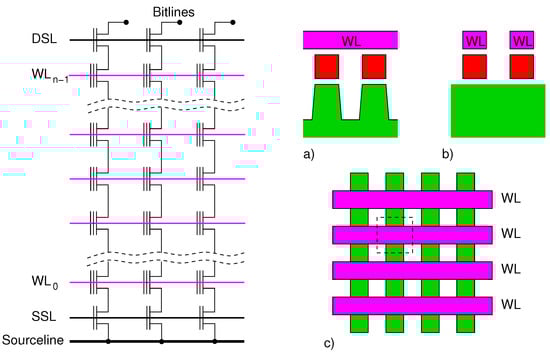 Cross-sections of a current planar NAND array are shown on the right of Figure 1: Figure 1a depicts a typical cut along the WL (green = silicon, red = floating gate, magenta = WL, white = silicon oxide), highlighting the shallow trench isolation used to separate the active area of adjacent devices [] and the planar structure of the cell, without any wrapping of the control gate along the floating gate sidewalls []. Figure 1b depicts instead the cross-section along the string direction. Figure 1c shows the layout of the memory array, which becomes extremely compact thanks to these solutions. In particular, given the feature size F of a given technology, i.e., the size of the smallest feature that can be created on silicon, the elementary memory cell (shown as a dashed square in Figure 1c) occupies the ideal area of . However, the effective cell area, i.e., total chip area divided by the number of cells, is somewhat larger than that because of the overhead circuitry, string contacts with BLs, dummy cells and select transistors. To decrease such overhead, the number of cells in a NAND string has reached the impressive number of 150 in the latest planar nodes [].