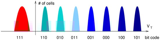 Pictorial view of the threshold voltage () distribution in a TLC cell. A three-bit code is associated to each of the levels.