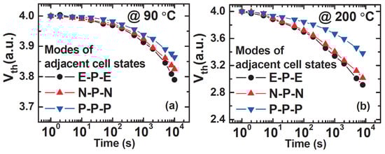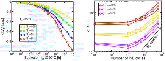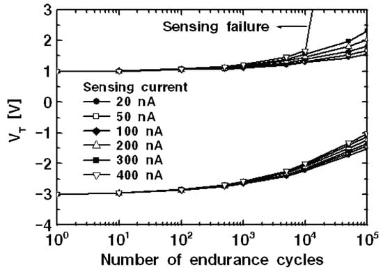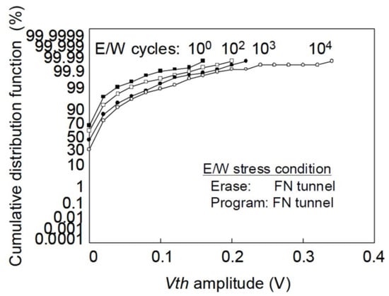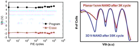 The same reasoning holds for the erase operation, but now the final condition is the one with the same field at the oxide-floating gate interface (the cathode during erase), which does not translate into the same , now dictated by the oxide trapped charge: a larger increase in vs. is then expected. This model was then refined [] to include the effect of charged stress-generated interface states, that provide an additional positive shift for both levels (while not influencing injection) for high cycling conditions, explaining the slight increase in the programmed . Finally, the effect of non-uniform tunneling current flow and oxide charge distribution over the area of scaled NAND devices have been investigated in [,], pointing out their effect on the endurance curve and on the assessment of the endurance degradation with scaling. A recent technique for separating the endurance degradation components, including subthreshold slope and transconductance, which also influence the values, has been reported in [].
