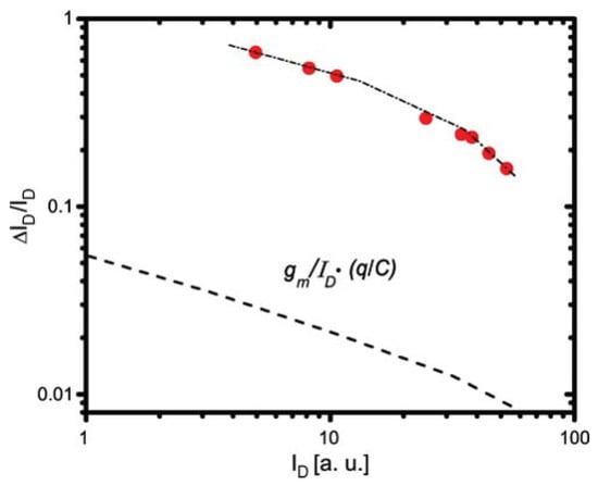 RTN fluctuation amplitude measured on a decananometer Flash cell (points = experimental data, dashed line = predictions from (2) when mobility modulations are neglected) [], © 2007 IEEE.