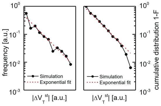 Monte Carlo results for the statistical distribution of the shift due to a single RTN trap, , are shown in Figure 6: an exponential distribution was found, which can be easily characterized by its slope , usually expressed in mV/decade. A thorough parametric analysis of was carried out in [,], resulting in the following dependence: