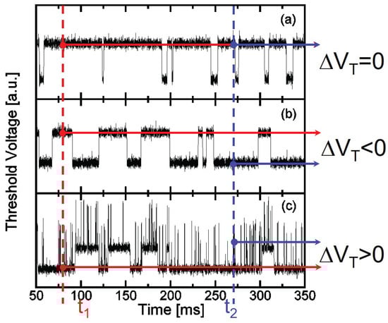 A simpler characterization technique for RTN is reported in Figure 8 [], where the values at two different times are recorded for each cell. The RTN amplitude is now defined as the difference between the two values. Note that this technique does not measure the maximum RTN fluctuation amplitude, as accomplished by [,,,], because a noisy cell can give either positive, negative or zero fluctuation, depending upon the sampling time (see the different cases Figure 8). However, this technique will return the actual RTN amplitude distribution that matters under real operating conditions, when a cell is read after being programmed.