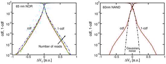 Typical results obtained with this technique are shown in Figure 9 for NOR (left) and NAND (right) Flash arrays [,,]. Figures show the cumulative density function (cdf) and its complement, highlighting clear exponential tails down to very low probability values [] for both high and low values. The region around is affected by Gaussian noise, and the exponential tails depart from such region at different probabilities. Note also that when is evaluated between the nth and the first read operation, the tails slightly increase with n. Differences between NOR and NAND RTN levels and amplitude are determined by cell design parameters (see Equation (3)) as well as by the cycling conditions.