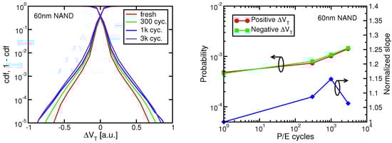 Figure 7 shows that RTN depends on P/E cycling. An increase in the tail height was also reported in [,,], where different technologies were compared. Figure 10 (left) shows experimental data for RTN in a NAND array for different cycling conditions: note that the exponential tails grow while their slope is hardly affected. This is reported in the right-hand side of Figure 10 where the slope of the exponential tails and the probability at a fixed value are shown as a function of , for the same technology. Note the negligible dependence of on , confirming that cycling results in a parallel shift of the RTN tails. The increase in tail height follows a power-law dependence with exponent for this technology []. Different values were found in NOR arrays, owing once more to differences in cell design and cycling conditions. Such dependences prompted several works and studies on the optimization of the cell process/architecture in order to reduce the extent of the RTN [,,,,,,,,,]. In the NAND array, moreover, the RTN amplitude was shown to depend on the cell position and state along the string [,] (because of the different transconductances, depending on the source and drain series resistances) and on the state of cells on adjacent BLs [] (because of the modification in the electron density profile induced by electrostatic interference).