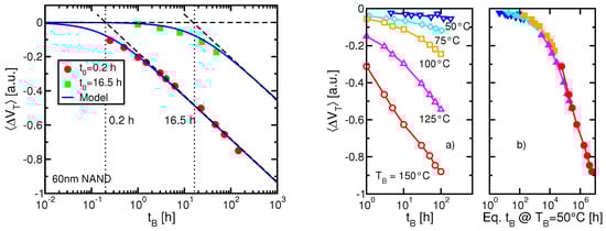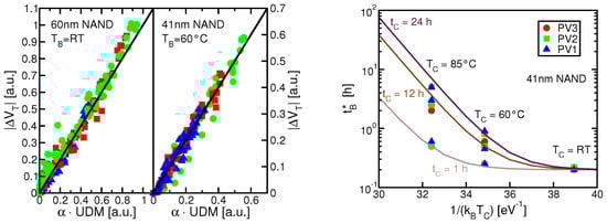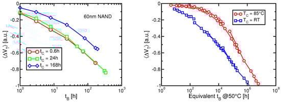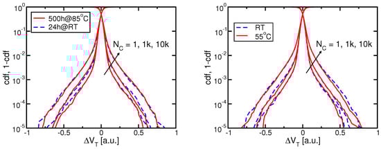 The cycling dependence was also investigated in [], in connection with the temperature dependence of RTN. Two cycling schemes were adopted, involving different temperatures and cycling times in accordance with the activation energy of damage recovery which will be discussed in Section 3.4. Then, RTN was read at room temperature. Figure 11 (left) shows that no significant difference can be detected in the RTN cdfs, meaning that the high-temperature phase applied during the 500 h scheme is not annealing any defect responsible for RTN. The right-hand side of Figure 11 shows instead the dependence upon the read temperature. Again, no dependence appears when the temperature is changed from room temperature to C. This result may seem surprising, as it is well known that trap capture and emission times are temperature-dependent [,,], but comes from the distribution of such times among the cells, as discussed in the next section.
